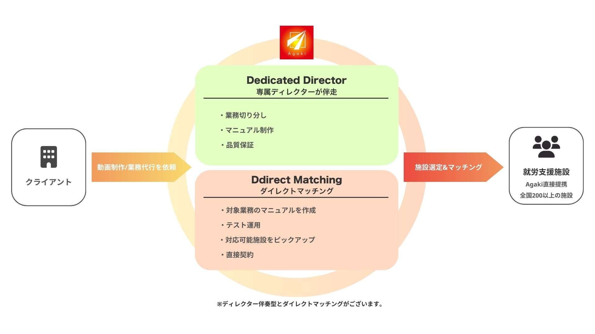 全国200以上の就労支援施設と“直接”連携。動画制作と業務代行で、企業の効率化と社会貢献を同時に実現するAgakiは“挑戦の機会”を社会に広げるパートナーです。